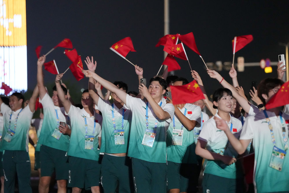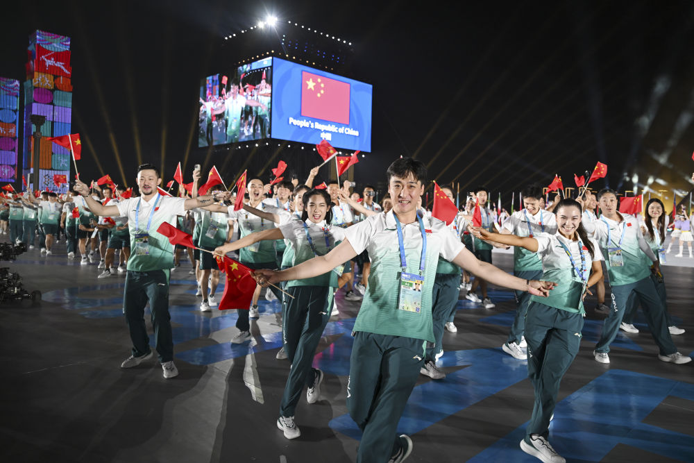 ↑中国体育代表团在开幕式上入场。新华社记者 杜子璇 摄