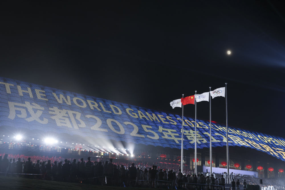 ↑这是开幕式上拍摄的成都世运会组委会会旗、中华人民共和国国旗、国际世界运动会协会会旗、国际奥林匹克委员会会旗(从左至右)。新华社记者 陈斌 摄