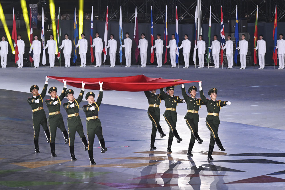 ↑中华人民共和国国旗在开幕式上入场。 新华社记者 姜克红 摄