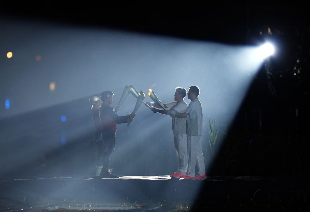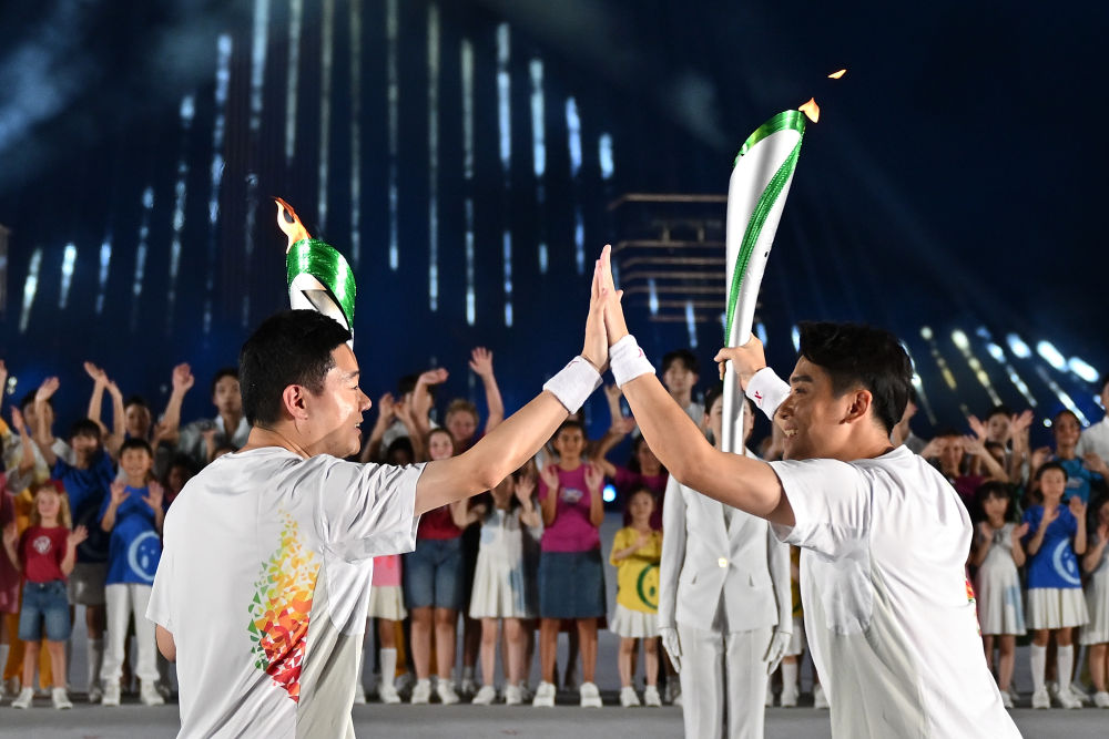 ↑火炬手在开幕式上进行火炬交接。新华社记者 王曦 摄