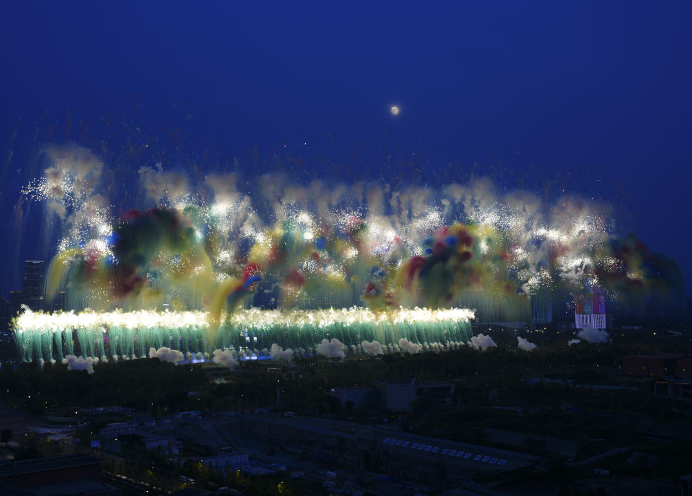 ↑这是开幕式现场燃放的焰火。新华社记者 陈益宸 摄
