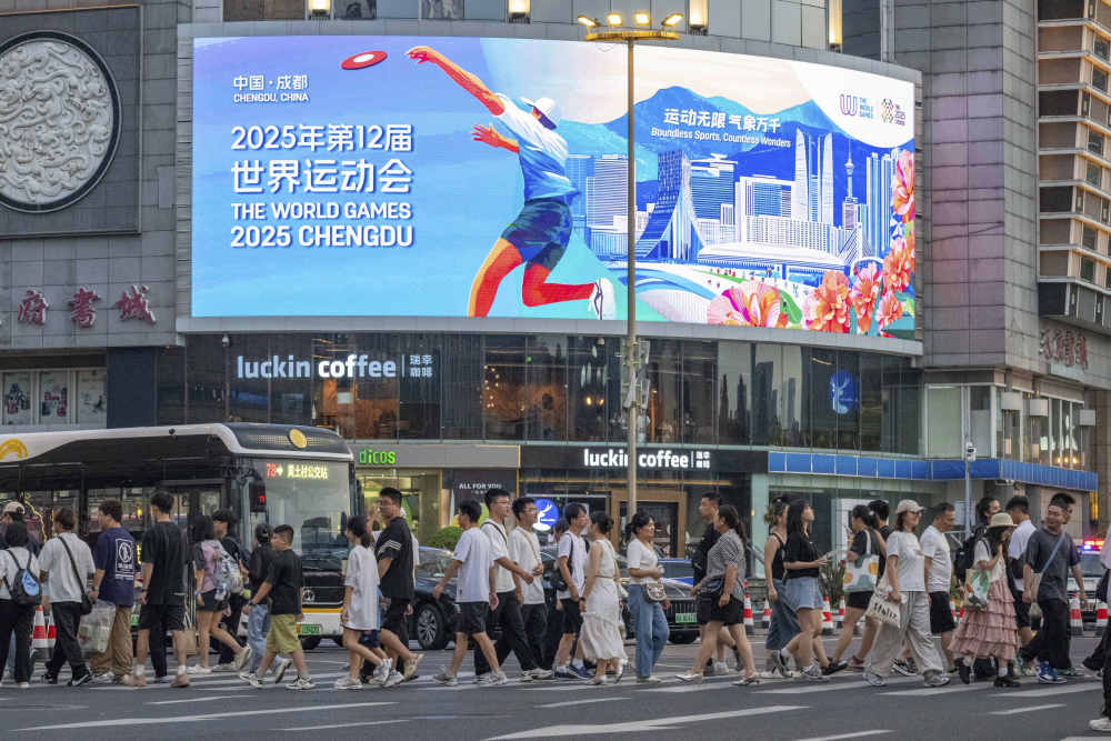 ↑在成都太古里拍摄的世运会倒计时牌。 新华社记者 张丽芸 摄