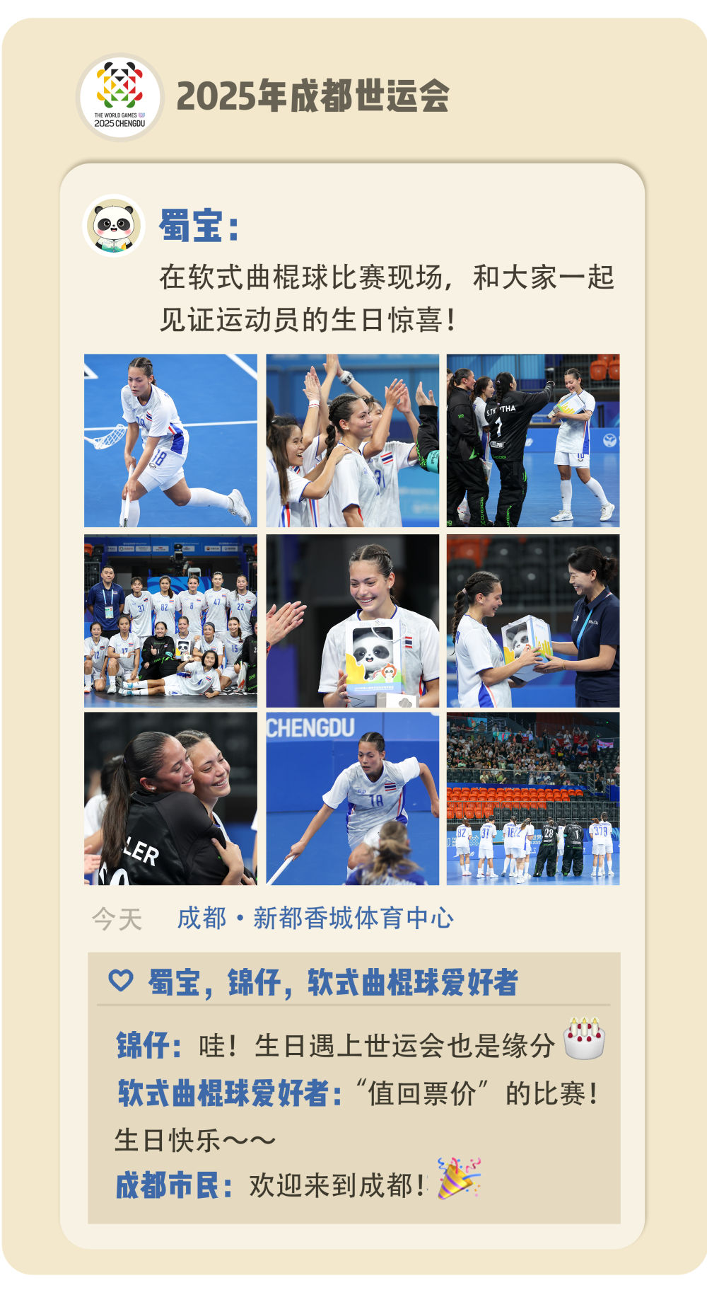 ↑成都新都香城体育中心工作人员为泰国队球员卡尔布姆(左)送上生日礼物。