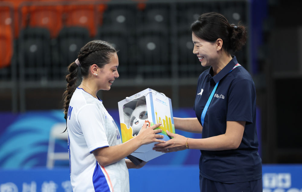 ↑泰国队成员在成都世运会软式曲棍球女子A组预赛后合影。