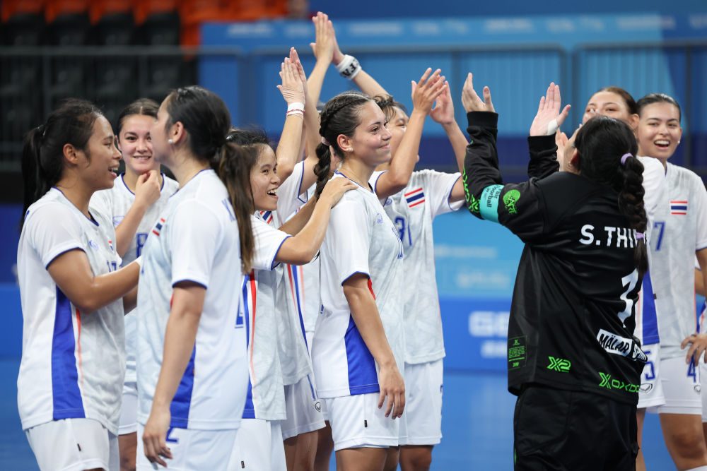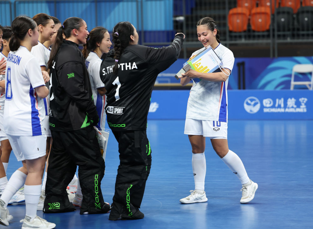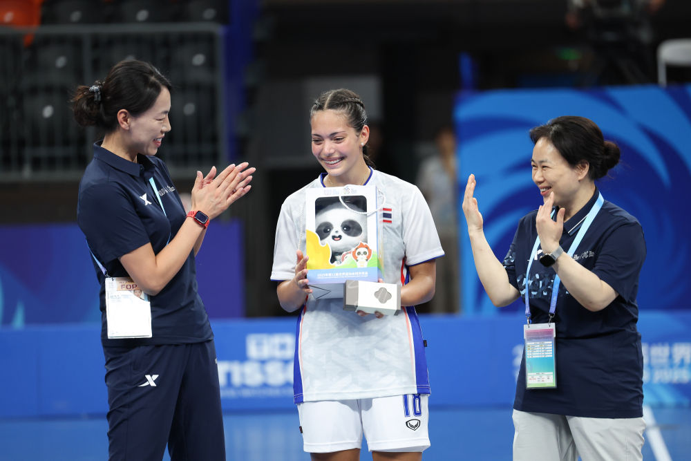 ↑泰国队球员卡尔布姆(右)在赛后接受祝福。