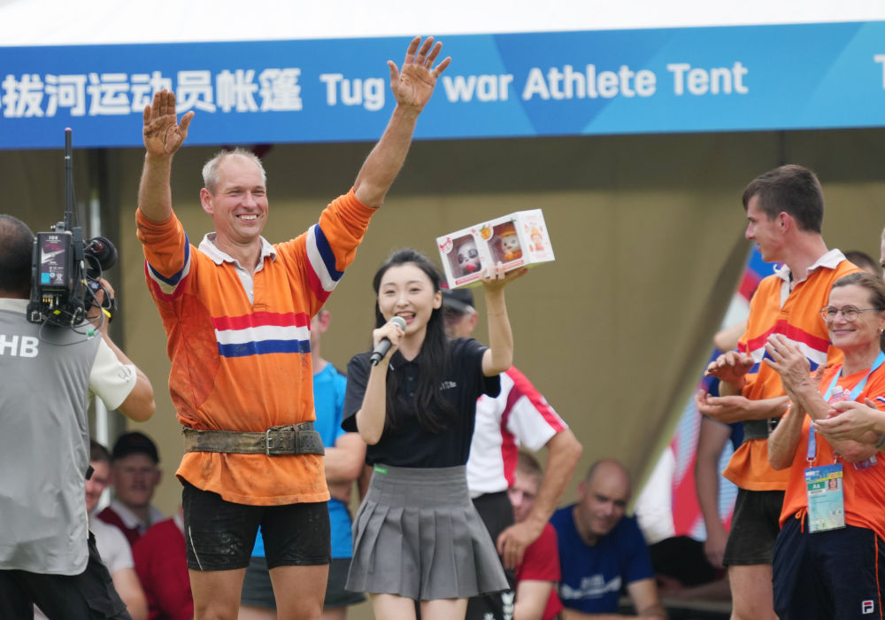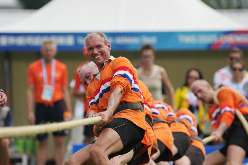 ↑荷兰队选手文森特·瓦根曼斯(前)在拔河预赛中。