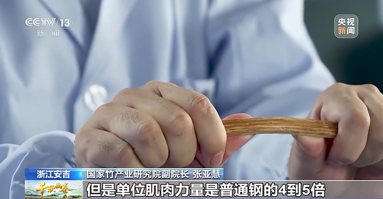 国家竹产业研究院副院长 张亚慧:这个“竹钢”的强度,是普通钢的1.5倍,但是单位肌肉力量是普通钢的4到5倍。我们让传统的竹材种植、加工业进入了新材料、生物制造这样的新领域、新赛道,附加值增加了3到5倍。
