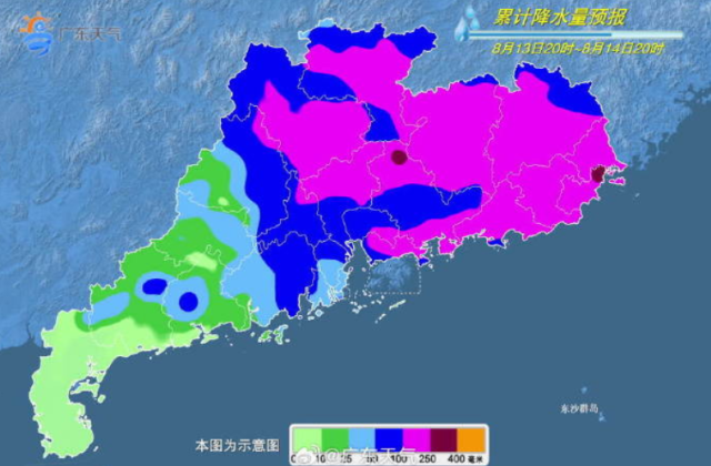 从降雨的具体落区看,14日白天到夜间,粤北、惠州北部、广州北部、肇庆北部自东向西有暴雨到大暴雨局部特大暴雨,同时粤东、珠三角其余市县有大雨到暴雨局部大暴雨,粤西市县有中雨局部暴雨。