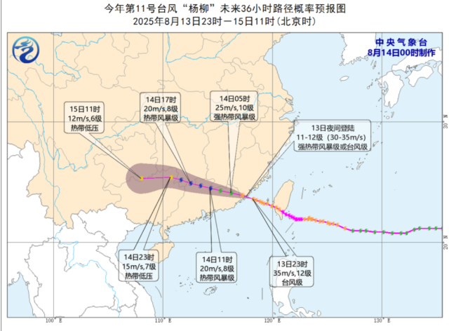 在13日13时前后,台风“杨柳”在台湾台东县太麻里乡沿海登陆,登陆时强度为强台风级(最大风力14级)。随后,它继续向西偏北方向移动,并于14日凌晨二次登陆华南。