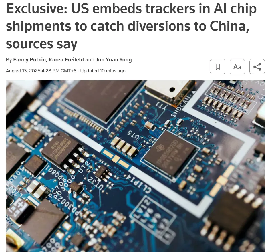 8月13日,路透社又刊发独家报道爆料,美国秘密在人工智能相关芯片中设置追踪器,以发现“芯片被转运至中国的情况”。