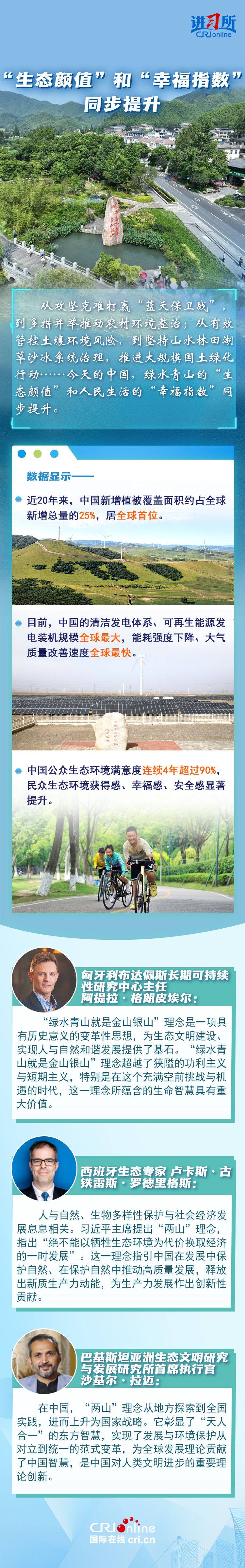 “从历史长河来看,如果说我们这一代人能留给后人点什么,我看生态文明建设就是很重要的一个方面。生态文明建设最能给老百姓带来获得感,环境改善了,老百姓体会也最深。”20年前,时任中共浙江省委书记的习近平在安吉余村考察时,肯定了余村下定决心关闭矿区、全面走绿色发展之路的做法,并首次提出“绿水青山就是金山银山”重要理念,20年来,这一重要理念带给中国大地一场革命性变化,直接推动美丽中国建设取得历史性成就。