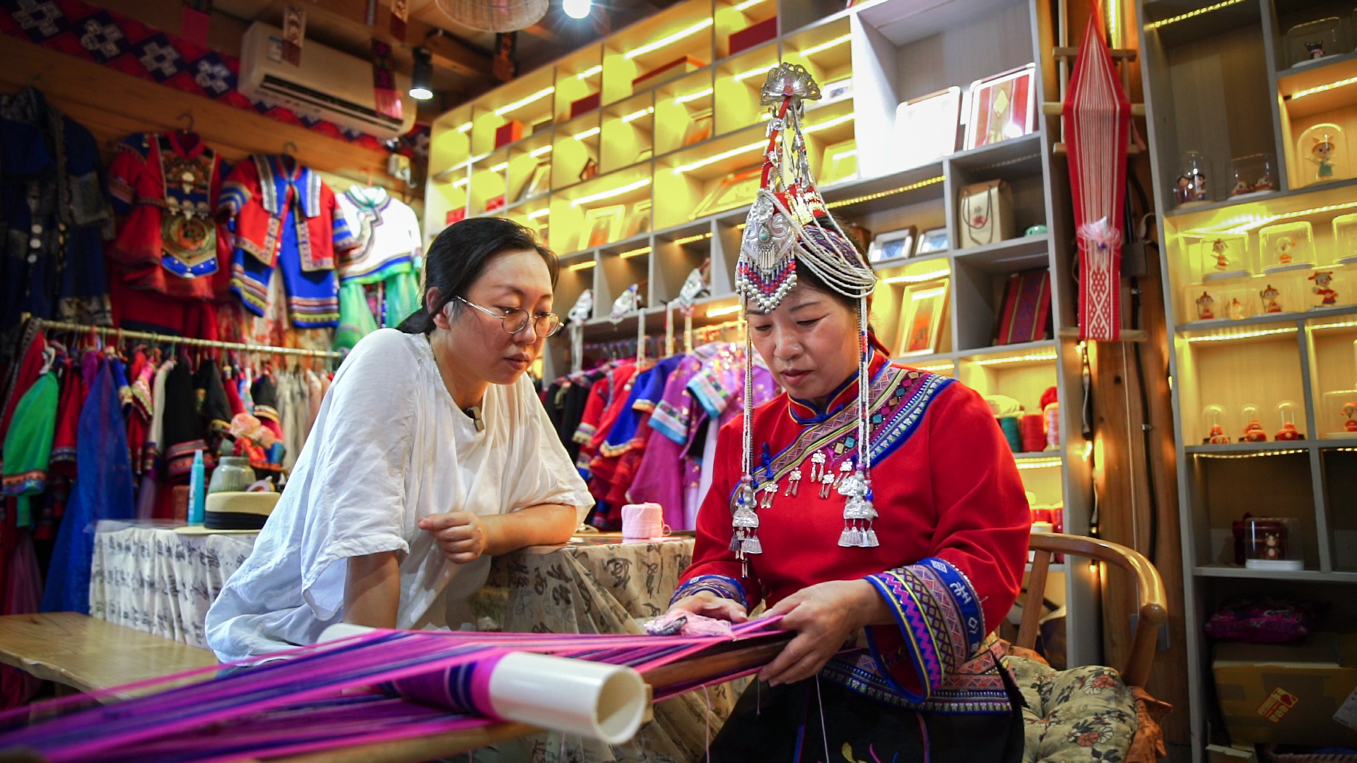 胡珊(左一)在库村非遗工坊学做畲族彩带(央广网发 林港 摄)