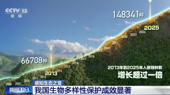 如今,《中国生物物种名录》上“入册”的生物种数,从2013年的6.7万种,增长到2025年的14.8万种,增长超过1倍。近500种野生动植物的受威胁等级出现下降。