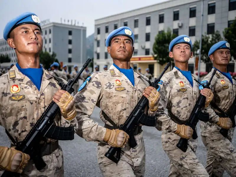 8月12日,北京,阅兵集训点,维和部队方队战士在训练中。