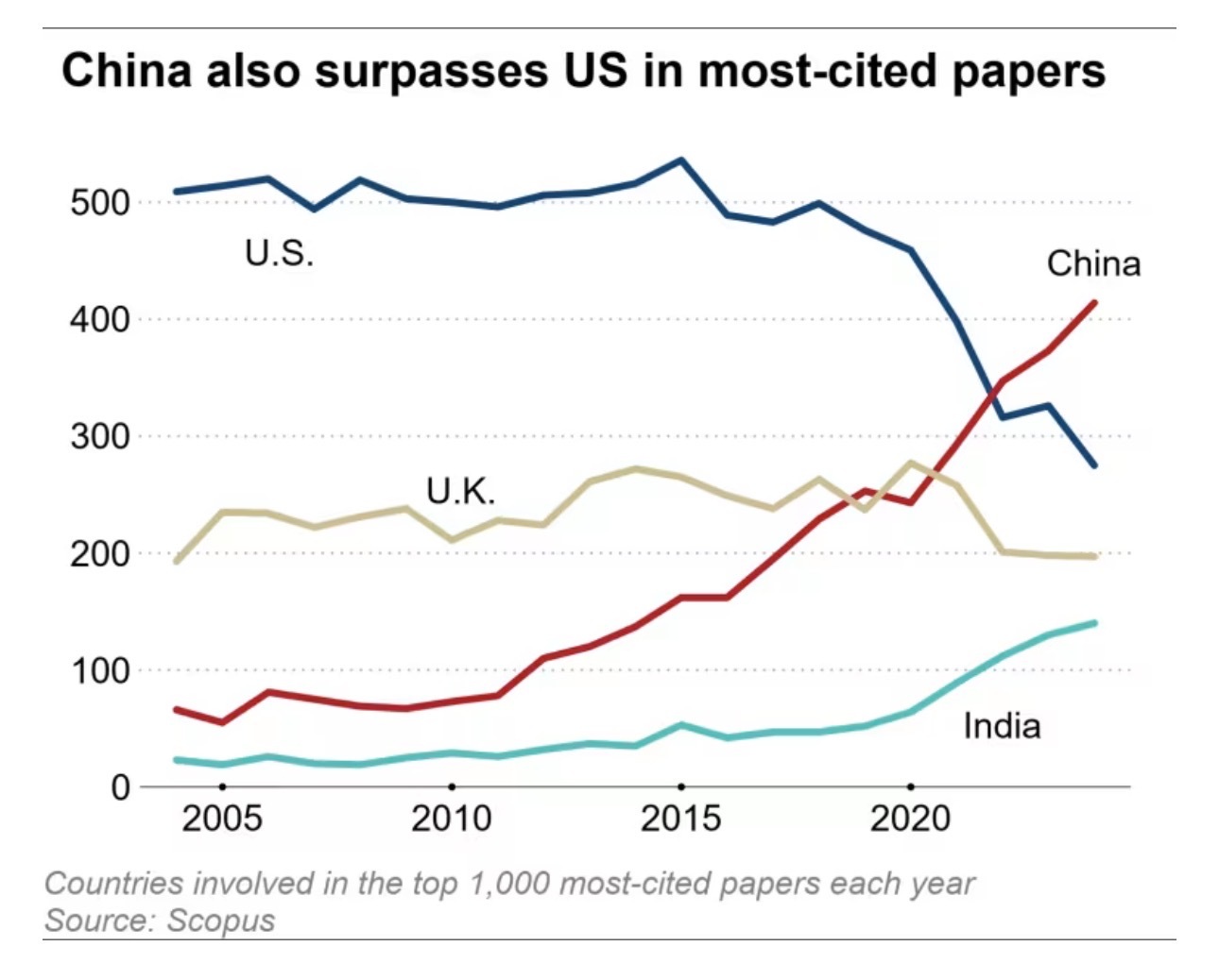 文章表示,中国气候变化研究论文在其他文献中的引用次数也在显著增加——这是研究质量的一个重要标志。从2004年到2024年,每年被引用次数最多的1000篇论文中,中国在2022年超越美国,占据了领先地位。