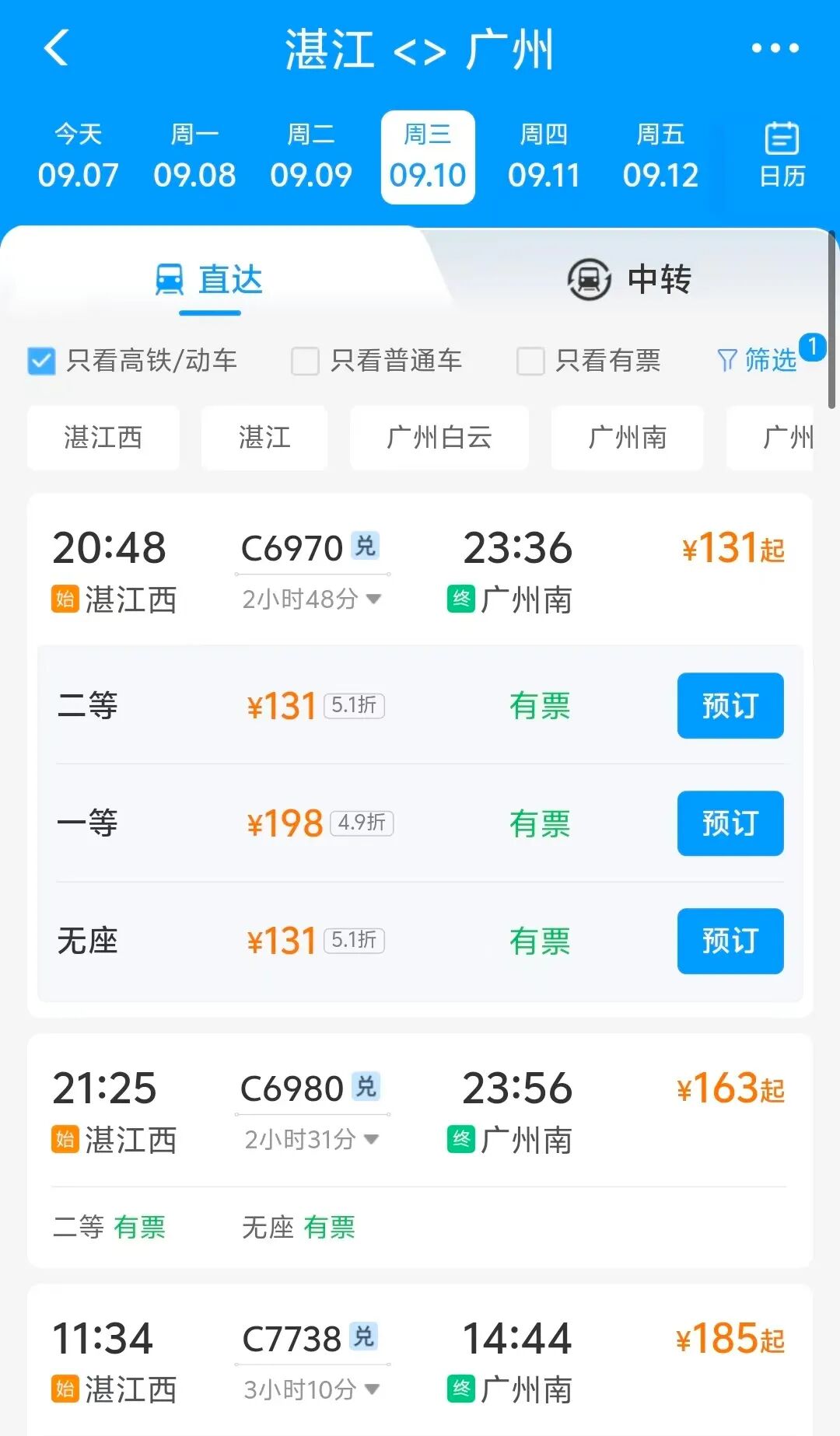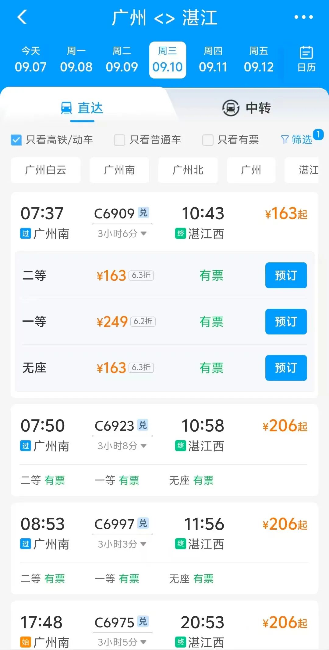 广州开往湛江方向的高铁向来是热门线路之一,记者今日查阅铁路12306发现,9月9日起,广州南站至湛江西站间多趟列车推出低折扣车票。