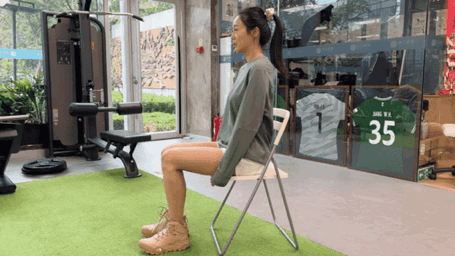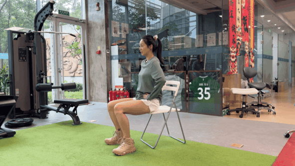 椅子起坐:坐在椅子边缘,双脚与肩同宽,身体稍前倾,用腿部力量站起,然后缓慢坐下。控制下落过程。每组 8-12 次,完成 2-3 组。
