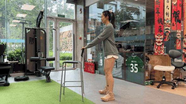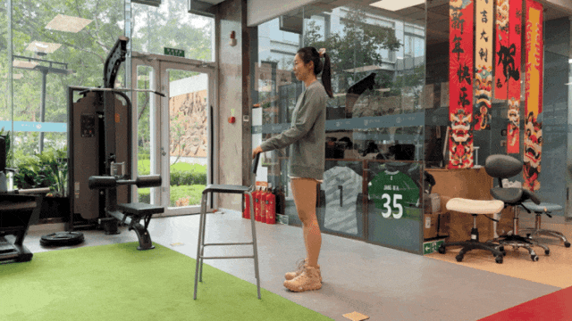 小幅度的深蹲:扶住稳固的椅背,双脚与肩同宽,缓慢屈髋屈膝下蹲,如同要坐椅子,臀部下降 15-30 厘米即可(不超过膝盖弯曲 90 度),然后站起。每组 8-10 次,完成 2-3 组。