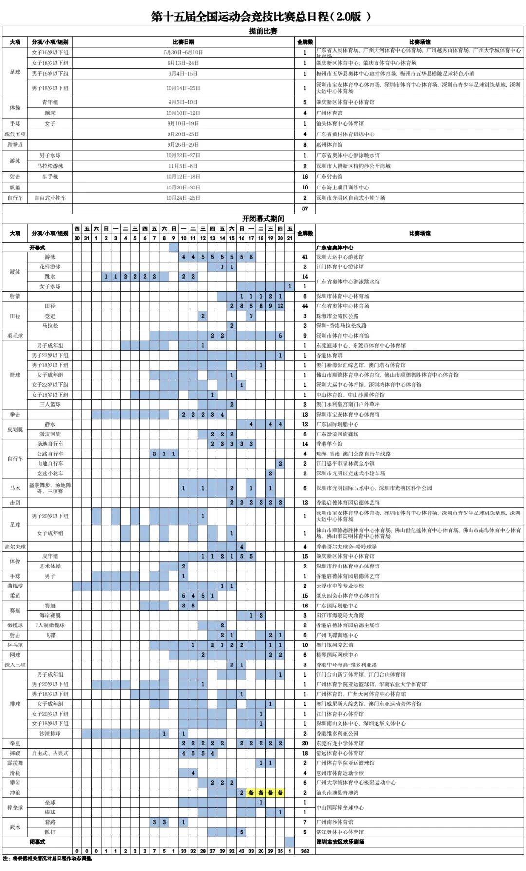 收藏!十五运会竞技比赛总日程(2.0版)公布!