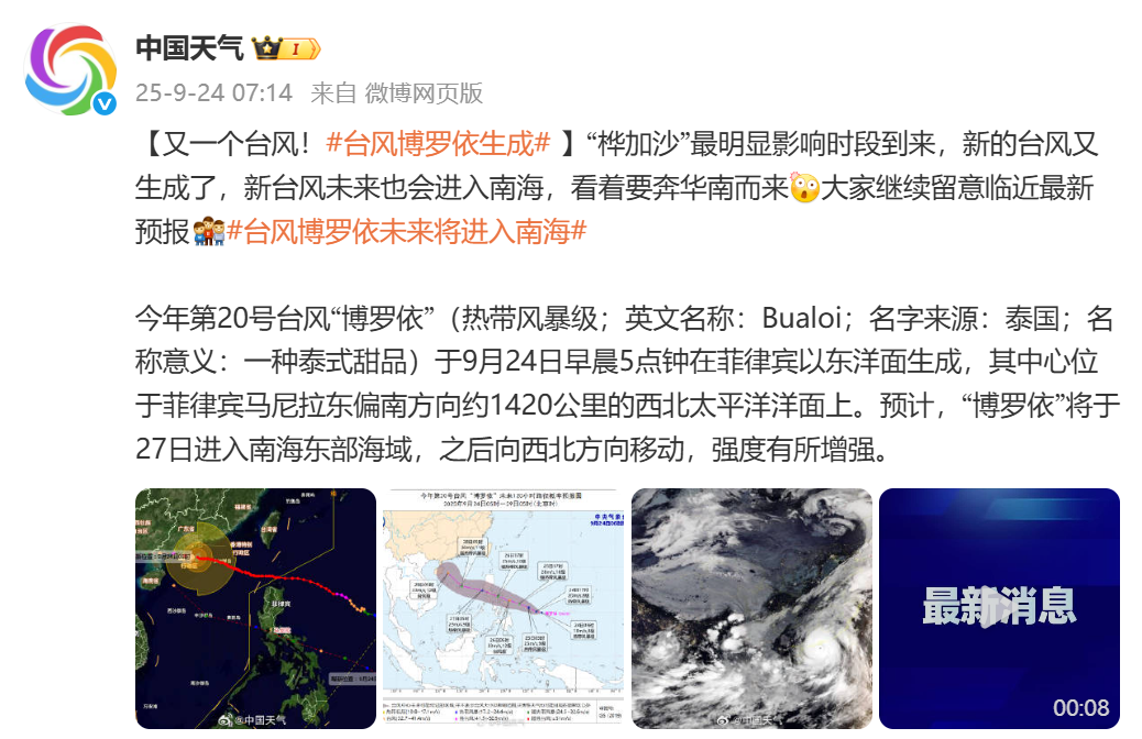 24日5时,今年第20号台风“博罗依”在菲律宾以东洋面生成。24日17时,“博罗依”中心位于距离菲律宾马尼拉东偏南方向约1270公里的洋面上,中心附近最大风力为8级(20米/秒)。预计其将向西北方向移动,9月26日前后穿过菲律宾吕宋岛进入南海东部海面,强度逐渐加强到台风级,9月28日—29日趋向海南岛东部海面。