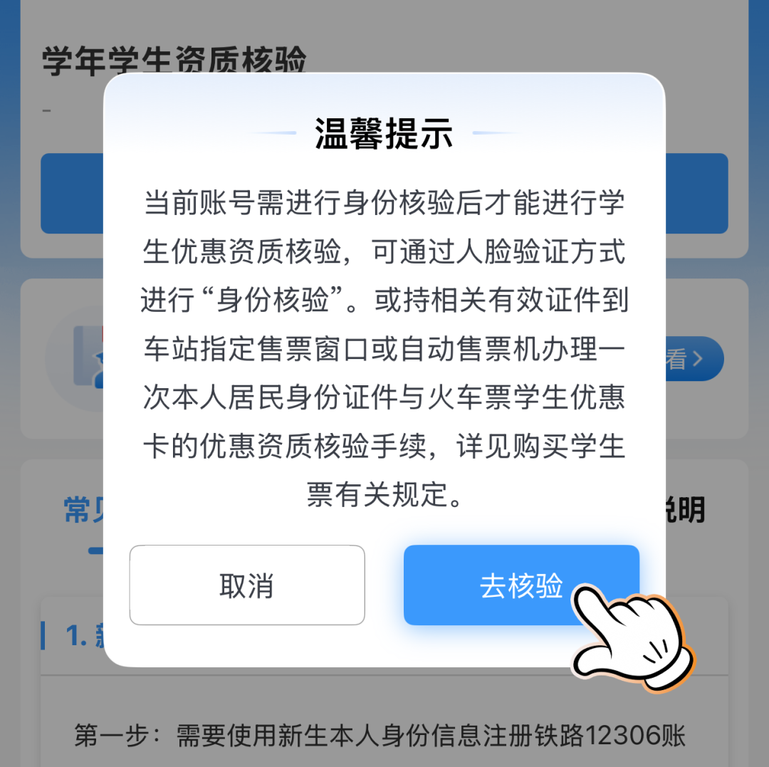 如系统提示需进行身份核验,请先通过人脸验证方式进行“身份核验”,再按照步骤进行学生优惠资质核验。