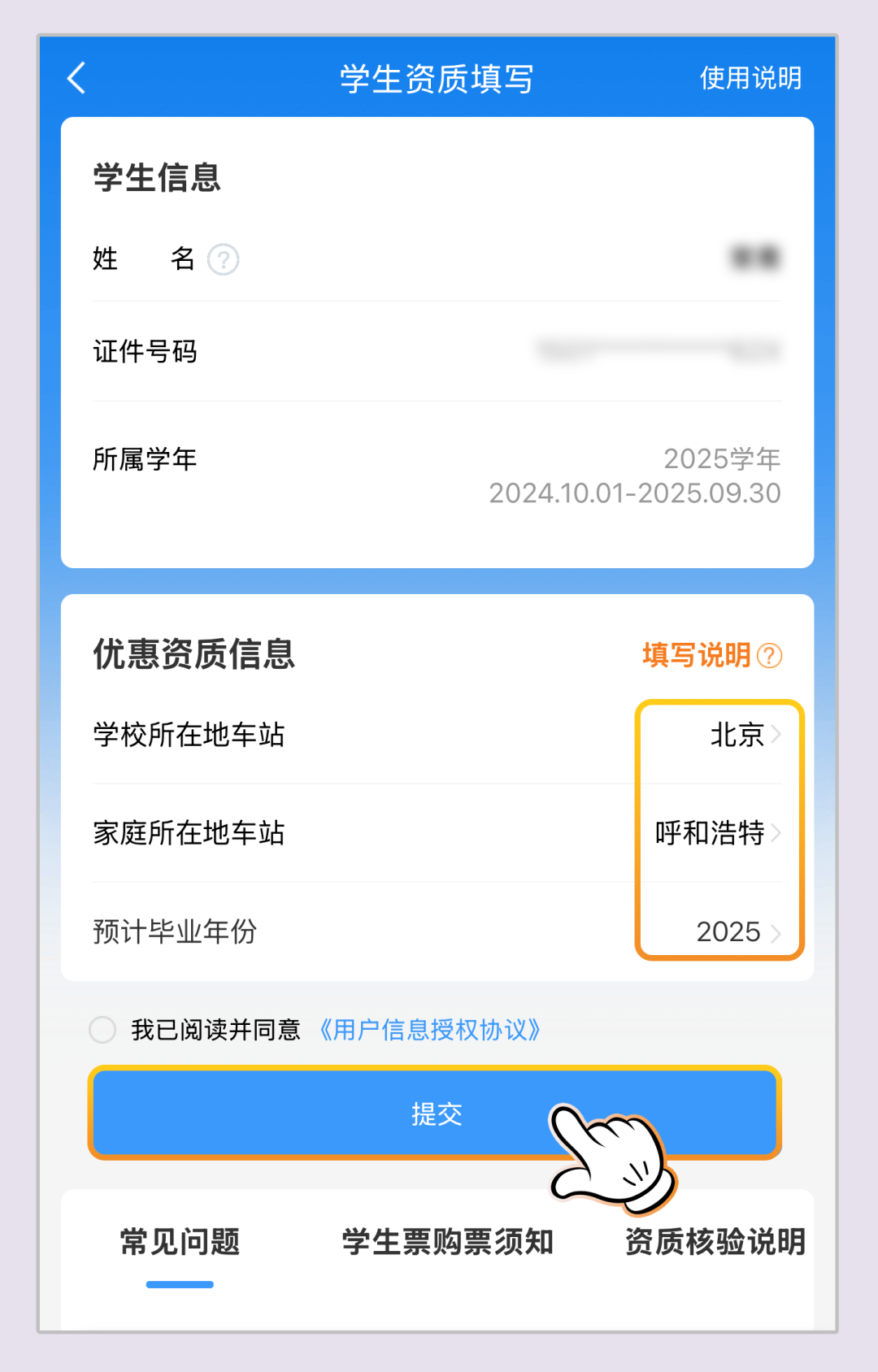 进入学生资质填写页面,按照实际情况填写优惠资质信息,最后点击【提交】即可。