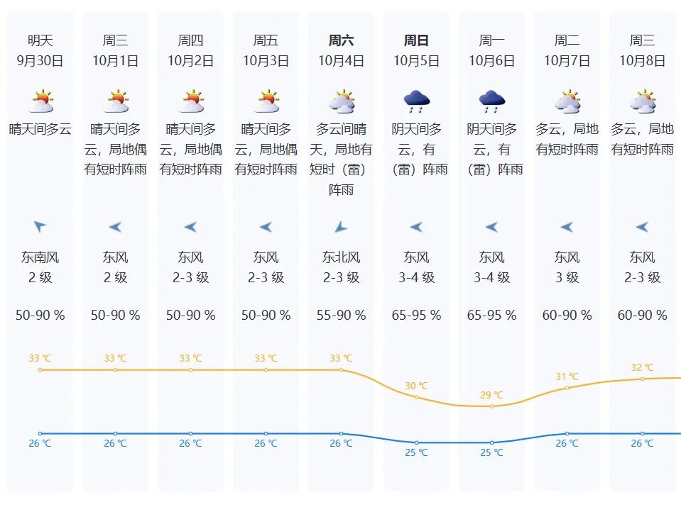 国庆节前至假期前期(9月29日-10月4日):晴天间多云,白天炎热,局地偶有短时(雷)阵雨,最高气温33-35℃。