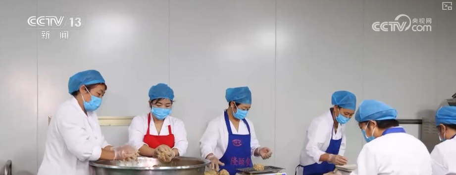 各种配料搅拌均匀后,工人们用面皮包裹馅料,揉成一个个面团,然后在模具的压制下做成月饼的面坯。经过30分钟的烘焙后,色泽金黄、香气扑鼻的香椿月饼就新鲜出炉了。
