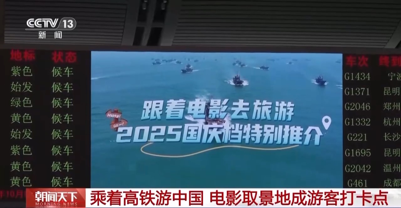 据了解,为持续推动“电影+”业态创新,国庆期间,在全国3000多个铁路客运车站、4200多组动车组列车的车厢电视上,集中播放《跟着电影去旅游》等影旅主题推介视频,不仅展示热门电影取景地,还联动多条铁路旅游专线提供出行指引,邀请旅客体验“铁路+电影”的出行新方式。