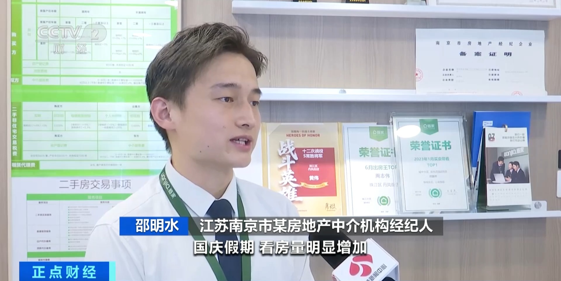 江州南京市某房地产中介机构经纪人 邵明水:国庆假期看房量明显增加,基本就是上午、下午(各一个),有的傍晚还要看一下。