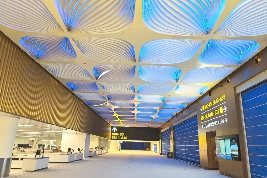 天花设计以动态流线勾勒“飞机从广州启航”的壮丽场景,地面石材铺装以“千年古道·商都印记”为灵感,复刻北京路古道遗址的层叠肌理。墙面设计以金色波浪形装饰板塑造“丝路金潮”的气象,金色材质呼应广州千年商都的辉煌底色。