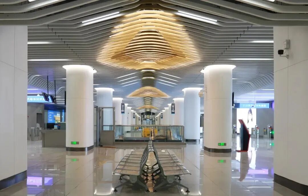 T3航站楼地下综合枢纽采用地下两层布局,公共区设计以“羊城启航·丝路新篇”为核心,将“飞机启航”的动感意象、北京路古道的历史底蕴与丝绸之路的贸易精神融合。