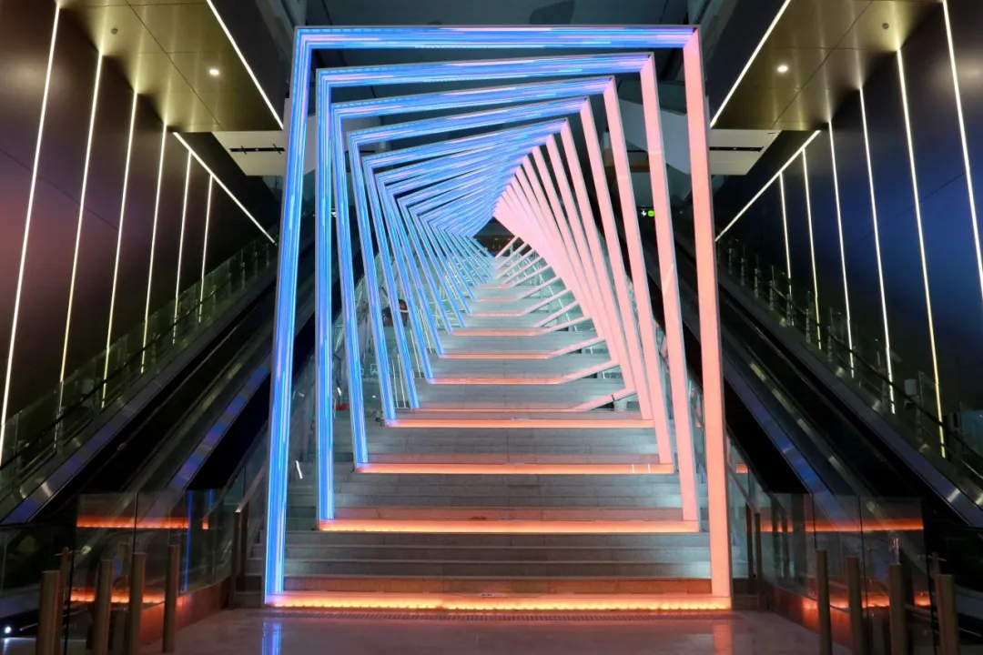 作为轨道交通与机场枢纽的核心衔接空间,景观楼梯以“时空穿梭・枢纽对话”为设计理念,以“数字门户”为灵感原点,成为广州城市形象的“第一眼名片”。