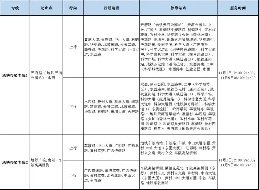 上述2条地铁接驳专线开行时间为11月1日12:00至24:00、11月9日06:00至24:00。此外,市交通运输部门还将重点加密天河区、黄埔区科学城区域常规公交发班班次,提升地面公交服务能力。