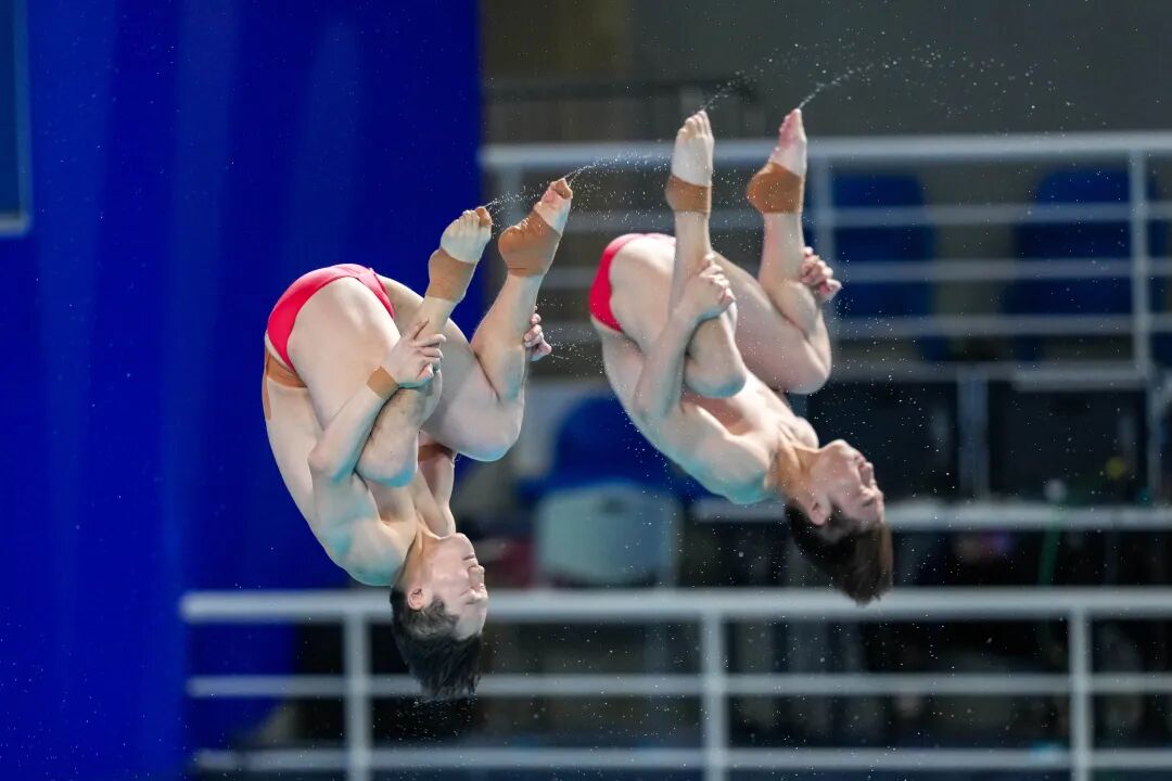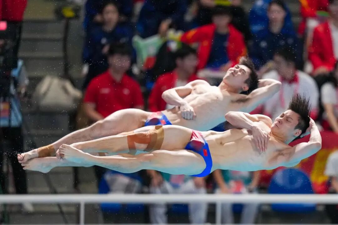 湖北队组合王宗源/郑九源在男子双人3米跳板比赛中