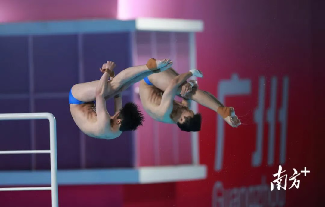 广东队组合郭昊宇/胡宇康在男子双人3米跳板比赛中