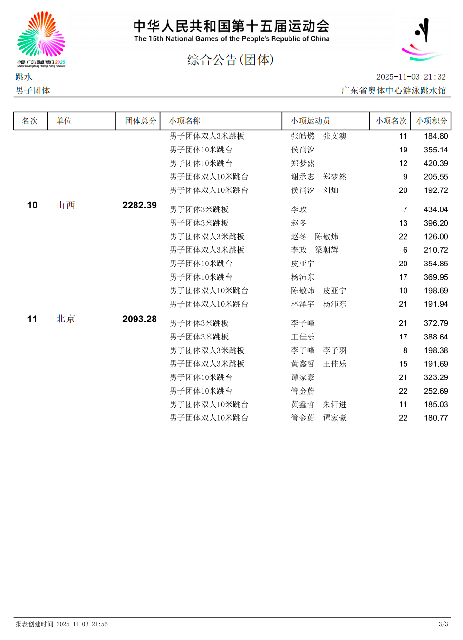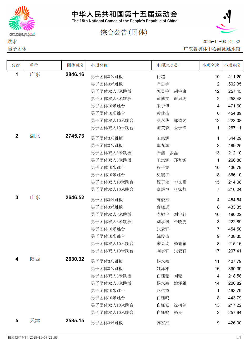 由陈艾森、谢思埸两位奥运冠军领衔的广东跳水男队以2846.16分的总成绩于11月3日晚成功卫冕全运会跳水男子团体金牌。由王宗源领军的湖北队以2745.43分位居第二。上届全运会该项目亚军山东队以2646.52分的成绩再次成功登上领奖台。