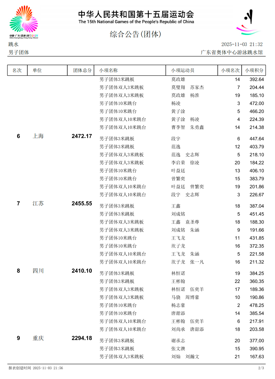 广东队陈艾森/朱子锋在双人10米跳台中以高难度和高完成度斩获第一,为广东队锁定跳水男团金牌。广东队成功包揽第十五届全国运动会跳水男、女团冠军。广东女队2日获得跳水女子团体金牌。
