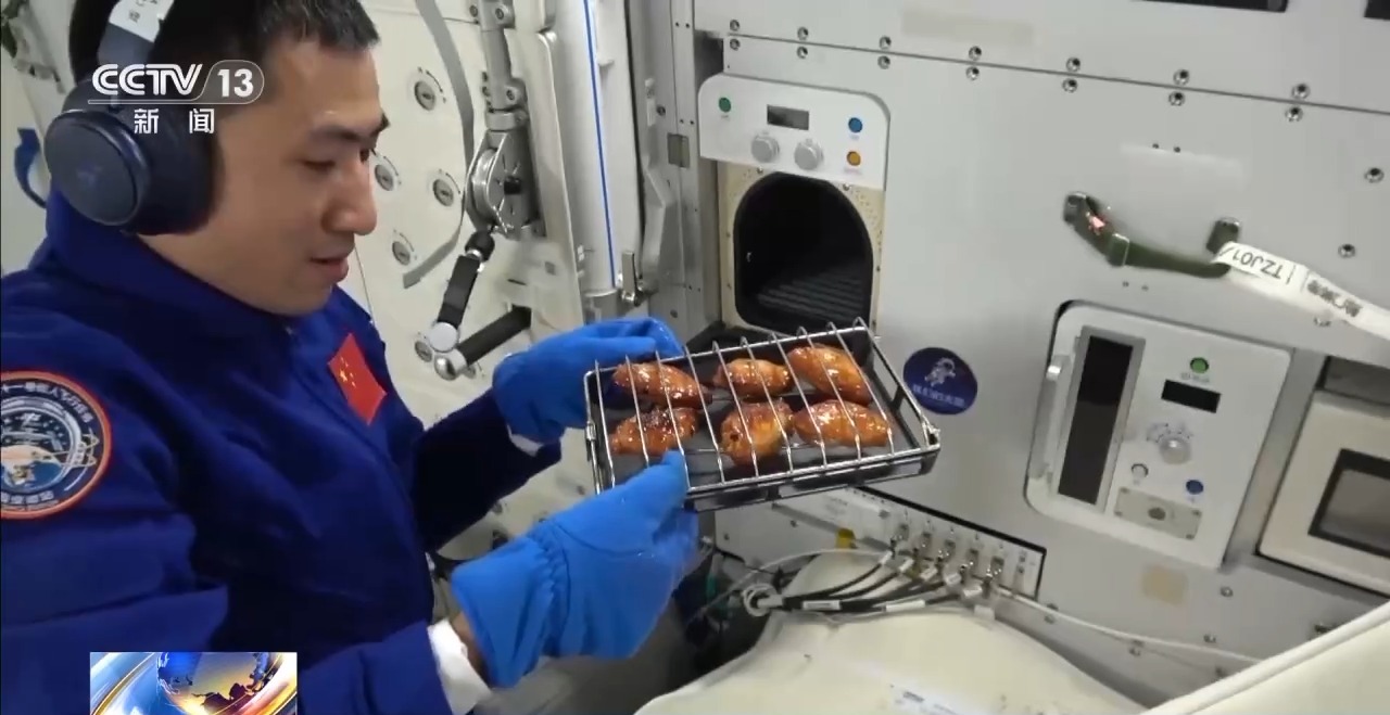 神舟二十一号乘组和神舟二十号乘组在轨成功会师,为了庆祝中国空间站第七次太空会师,六名航天员使用刚刚被带上太空的新装备——热风烘烤机,在空间站做了一顿烧烤大餐。