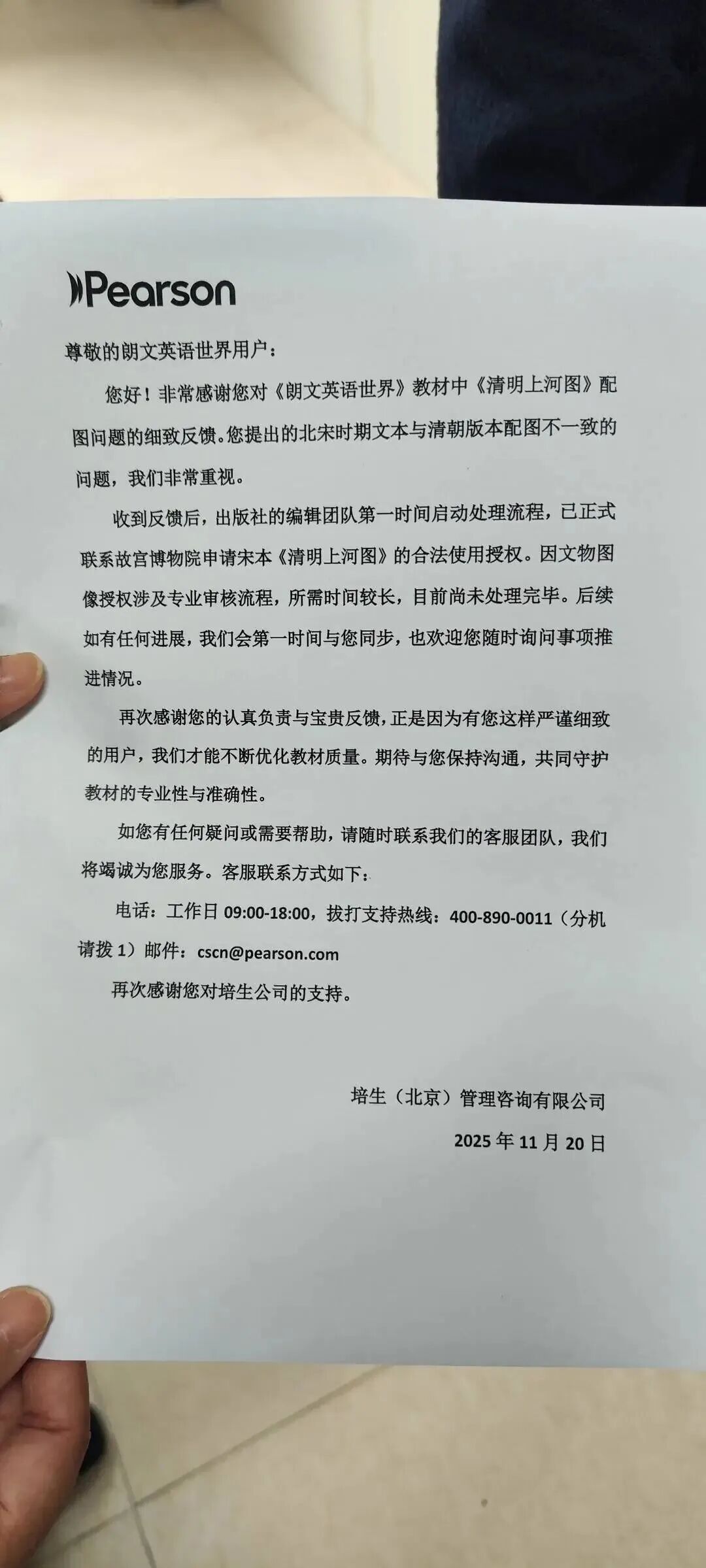 信中明确表示,编辑团队已启动处理程序,正在积极联系故宫博物院,申请合法使用宋代原版《清明上河图》图像的授权。
