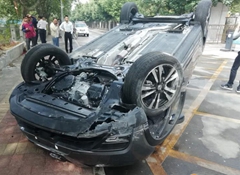新手一个动作 东莞小车“四脚朝天”翻侧在路边