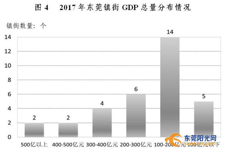 镇域经济实力更加雄厚。40年来,东莞镇街经济快速发展,实力更加雄厚。2017年,在全市33个镇街(含松山湖)中,全部镇街经济规模均超60亿元,平均规模超200亿元。经济总量达500亿元以上的镇街有虎门和长安2个,400-500亿元的镇街有东城和南城2个,300-400亿元的镇街有厚街、松山湖、塘厦、常平4个,200-300亿元的镇街有大朗、凤岗、寮步、清溪、大岭山、麻涌6个,100-200亿元的镇街有14个,100亿元以下的镇街有5个。