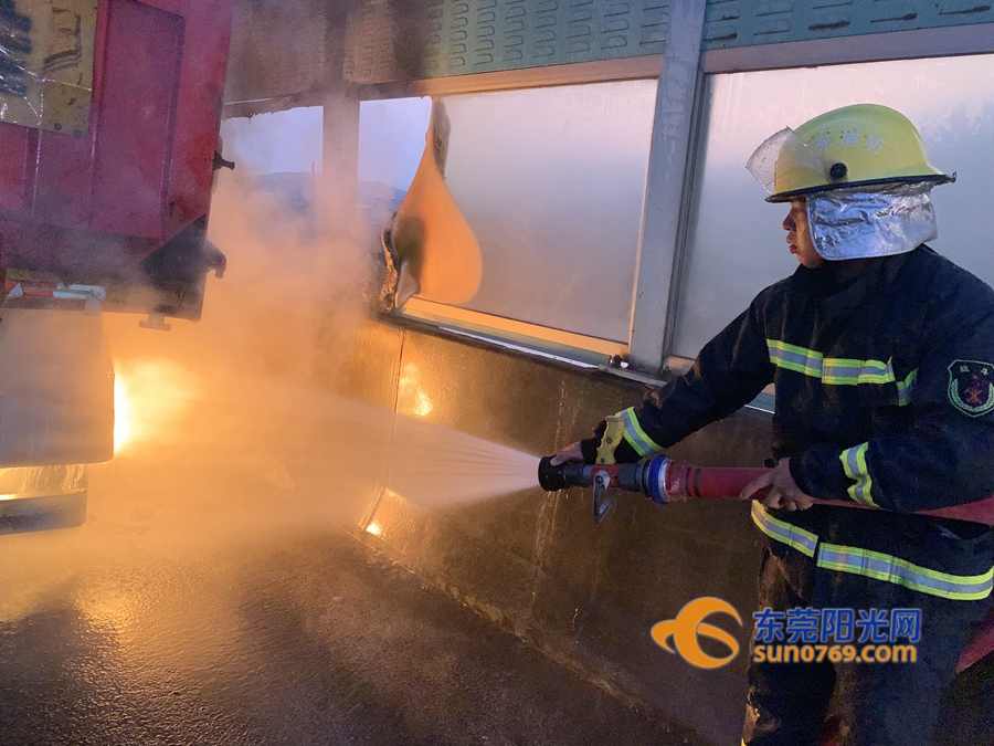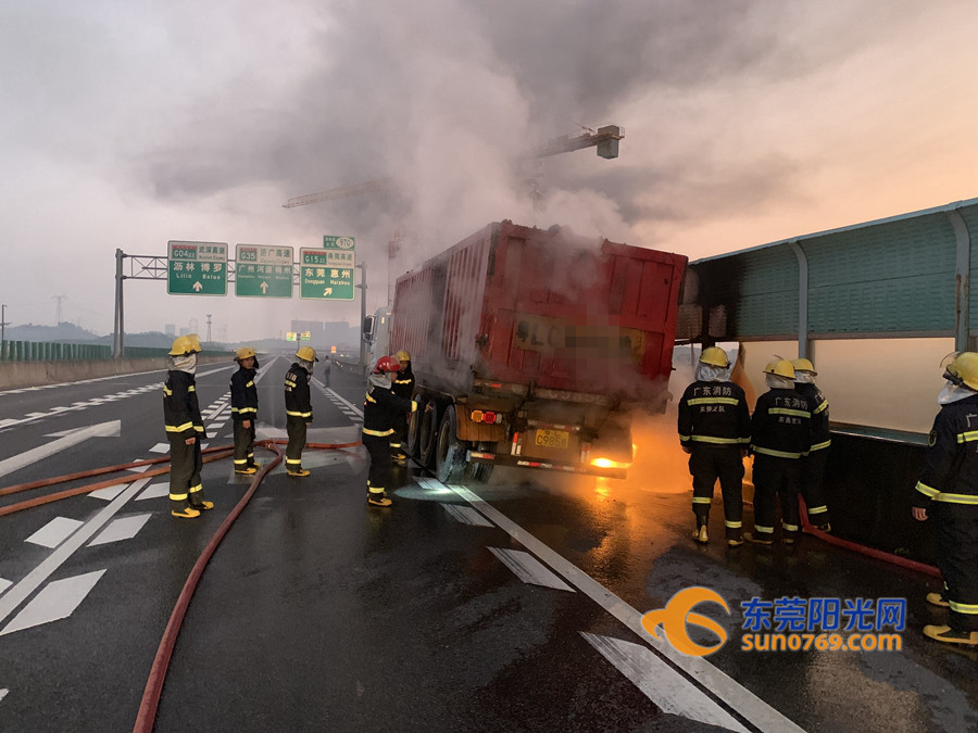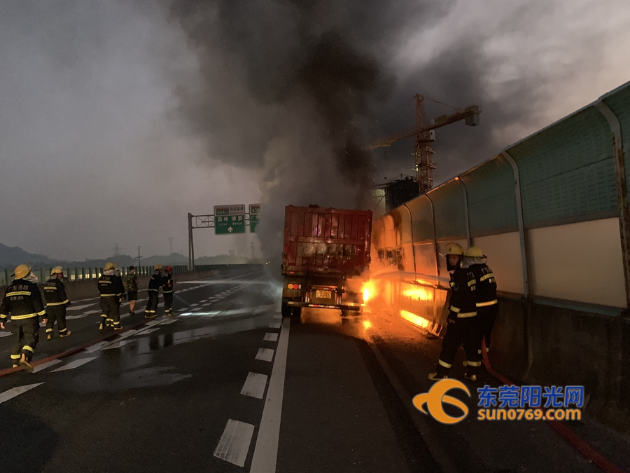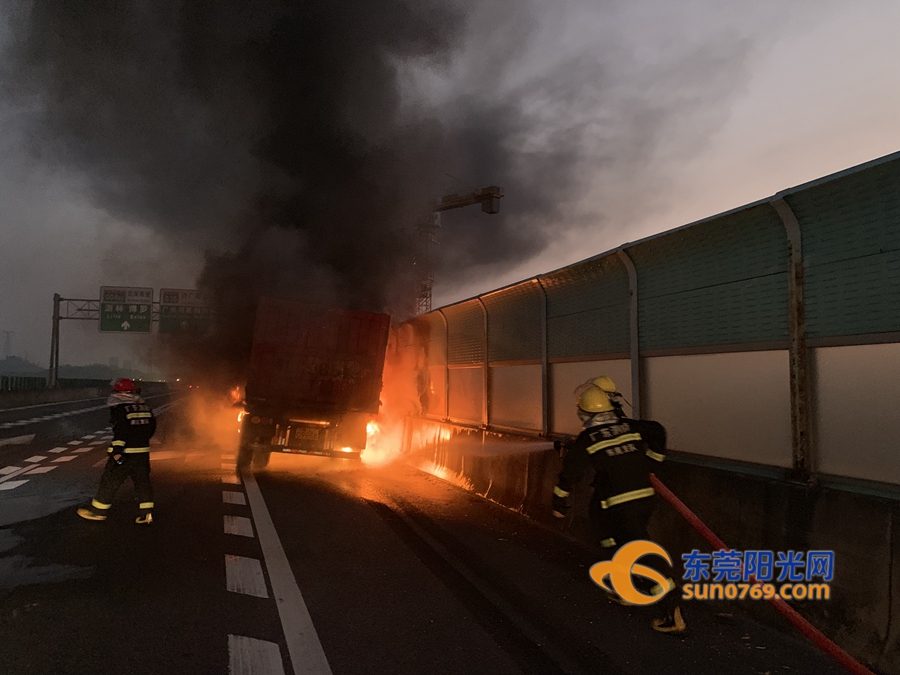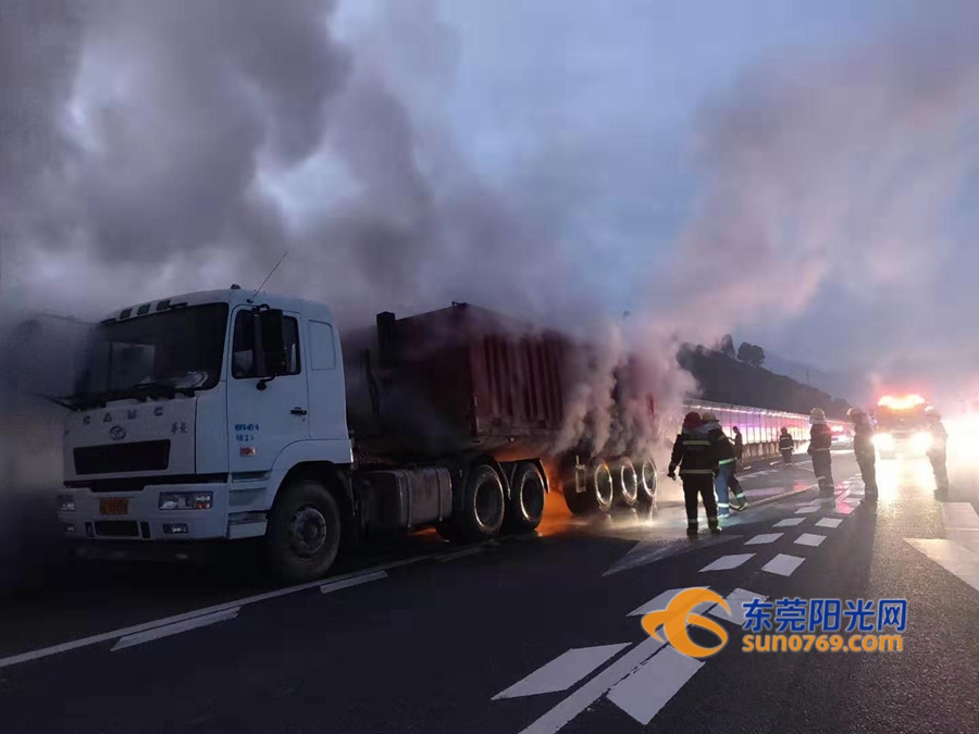 东莞阳光网讯 2019年10月21日清晨5时38分,博深高速往深圳方向谢岗服务区一辆满载石子的挂车在行驶过程中轮胎突然起火,火势迅速蔓延,情况十分紧急。谢岗消防大队接到报警后,立即出动灭火救援力量火速赶往现场营救。