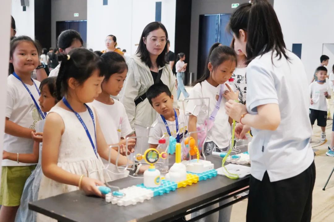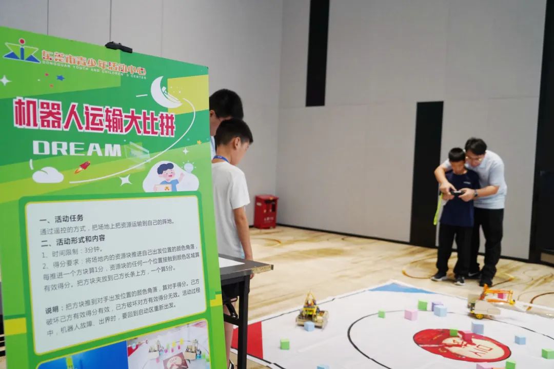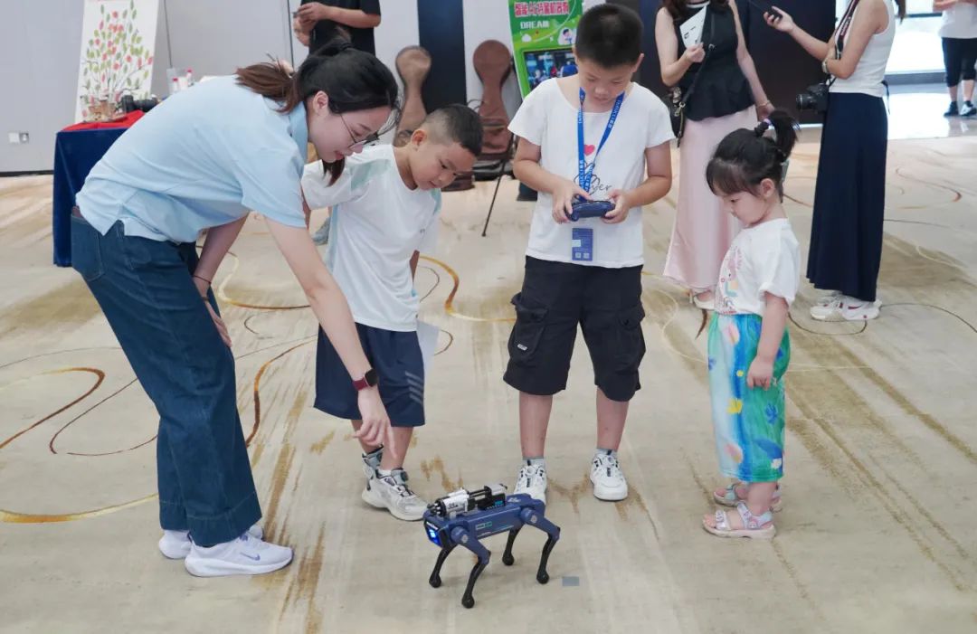 仪式结束后,慕思员工和孩子们踊跃参与了东莞市青少年活动中心提供的互动体验项目。打击乐、古筝、琵琶、语言艺术、机器人运输大比拼、智能AI特警机器狗、微观世界、弹射飞行器、电磁迷宫、爱国拼拼乐等项目吸引大家热情参与,现场热闹非凡,大家都沉浸其中。