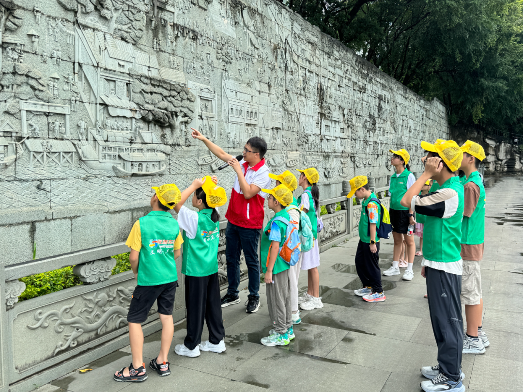 “小候鸟”首先来到《石龙古镇图》参观点。在专业解说员的细致讲解中,这座高7米、壁长128米的巨型浮雕向大家生动地“铺开”石龙镇悠久的历史脉络。随着对石龙商贸变迁、民俗传承和生态发展的系统了解,“小候鸟”深刻领会到历史文化保护与生态环境保护的共生关系,文化传承的种子也在他们心中悄然播下。
