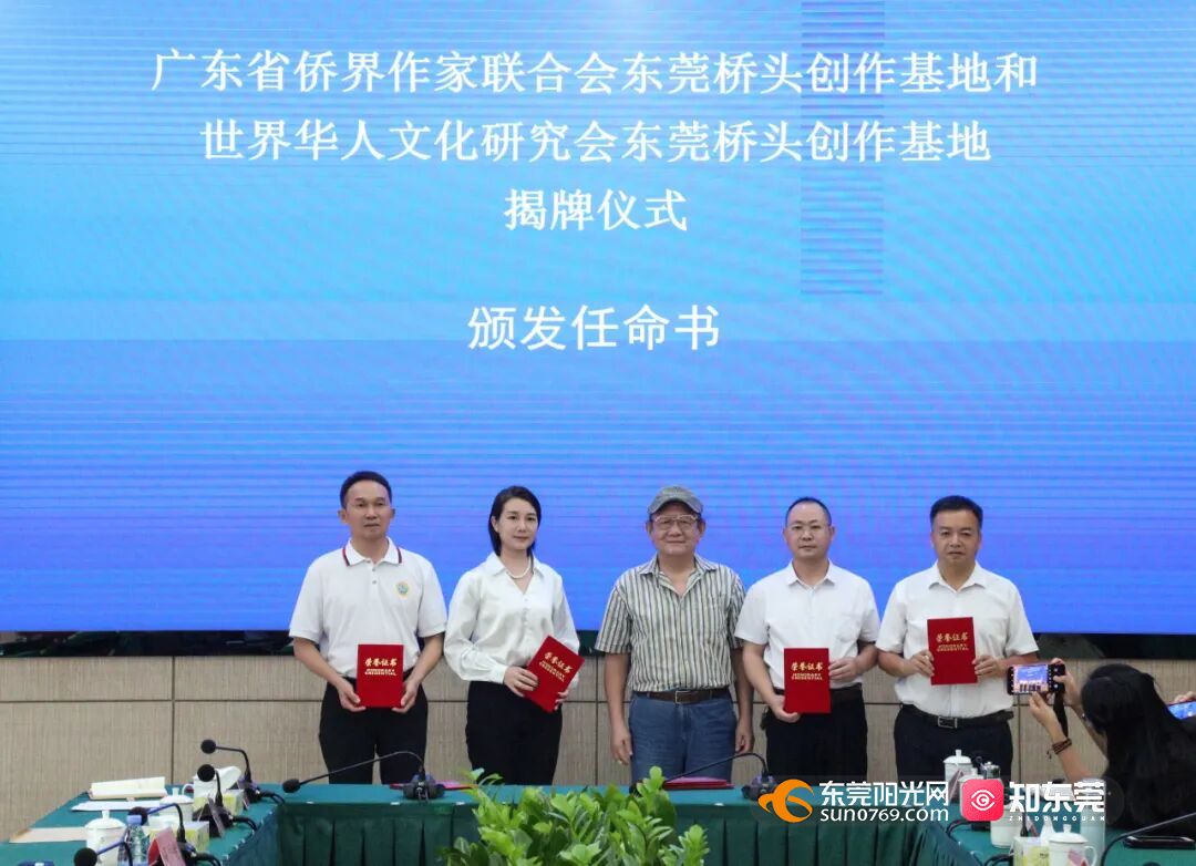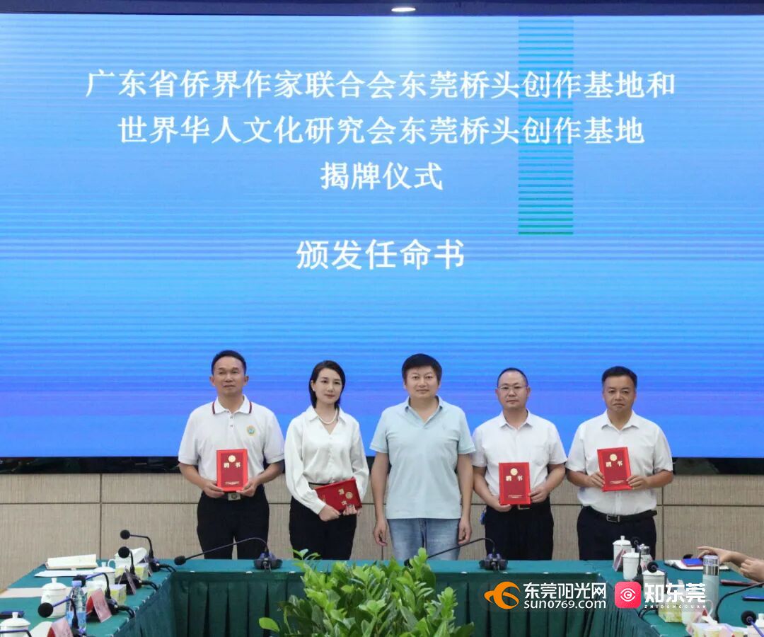 仪式上,领导嘉宾共同为 “广东省侨界作家联合会东莞桥头创作基地” 和 “世界华人文化研究会东莞桥头创作基地” 揭牌。广东省侨界作家联合会会长刘迪生、世界华人文化研究会主席张文峰分别为创作基地主任刘帆及各副主任颁发任命书。