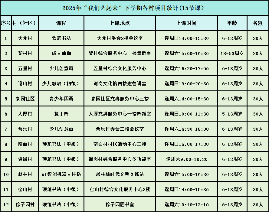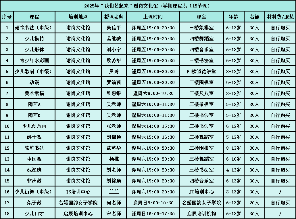 值得一提的是,本次公益课程除了在谢岗文化馆开设外,各村(社区)也将同步开展,让更多孩子在家门口就能享受到优质的艺术教育。