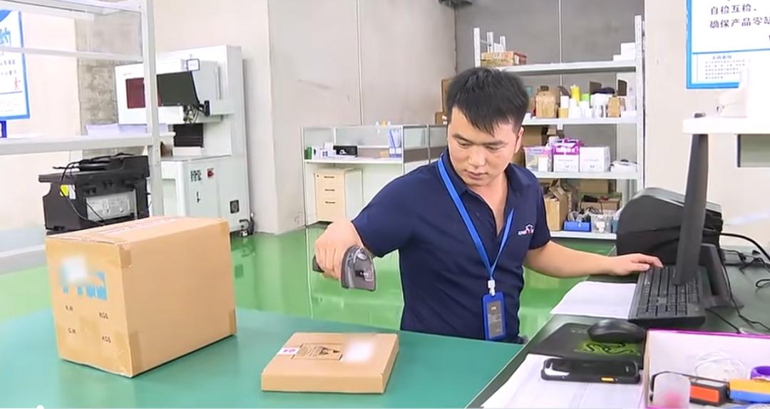 ▲工作人员手持智能终端扫描货物条形码