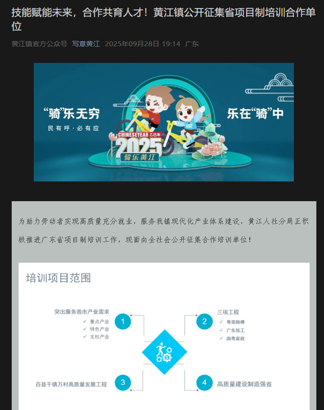 广发“征集令”,汇聚社会力量共建培训项目。9月底,分局通过“写意黄江”官方公众号面向社会发布项目制培训合作征集公告,广泛动员企业、事业单位、社会组织等有培训意愿的主体共同参与项目建设,旨在围绕产业发展和市场需求,携手打造一批高质量、接地气的培训项目,持续拓宽技能人才培养路径。