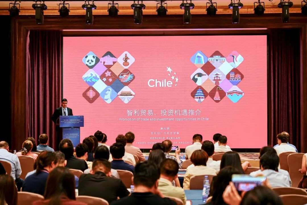 智利驻广州总领事馆商务领事宋元明在现场进行了智利贸易和投资环境推介。他提到,智利拥有得天独厚的地理环境,同时依托稳定的制度结构,持续推动多样性、创新、包容与数字化发展。在经贸合作层面,智利已签署34项经贸协议,覆盖65个经济体,且在175种产品的世界出口排名中位列前十,其中葡萄、核桃、纤维素浆等产品更是稳居全球出口前列。此外,宋元明还重点介绍了中智55年的合作历程,并指出智利在农业食品、工业4.0、创意产业、可再生新能源等领域的投资潜力。